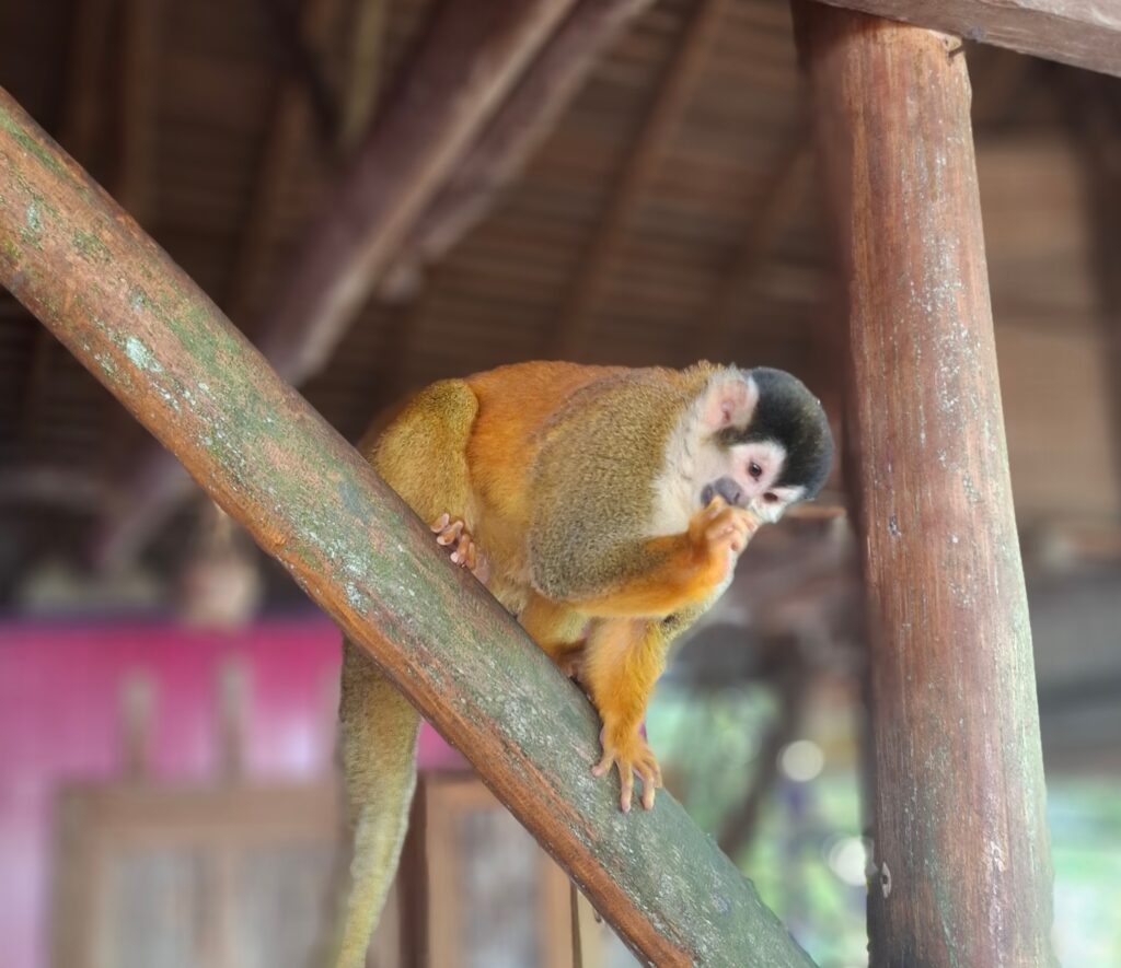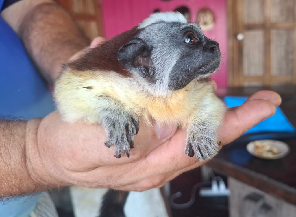 Also here live ‘dreamers’, people who want to escape from it all, as it is still possible to buy an island or an enormous piece of rainforest for an reasonable price. They make a living by providing a bed and breakfast, guided tours through their rainforest, have a ‘yachtclub’ (bar) on an island, keep some pigs and chickens and in one case: start a monkey refuge. They even have the smallest monkey in the world, the pygmy marmoset or finger monkey.